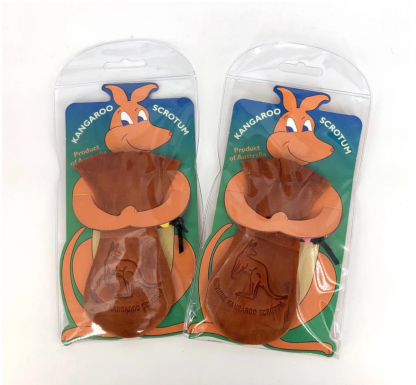 This uniquely Australian Kangaroo Scrotum Pouch would make a great gift. Ever since the Aboriginal dreamtime, long ago, the Kangaroo Scrotum, has been known to bring good luck and great fortune to its owner. Sizes will vary.